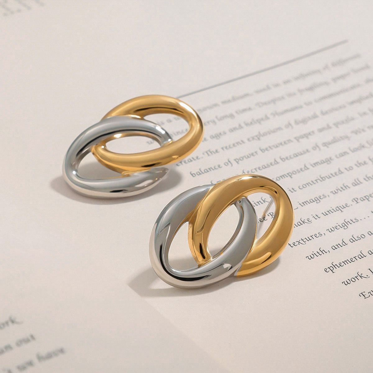 Minimalist does not mean ordinary. This earring uses a double oval geometric structure to interpret the modern sense. The contrast and balance of gold and silver color matching make the simple style more design-oriented. The overall lines are clean and neat, and the shape is strong. It is a versatile earring item suitable for daily use and occasions.