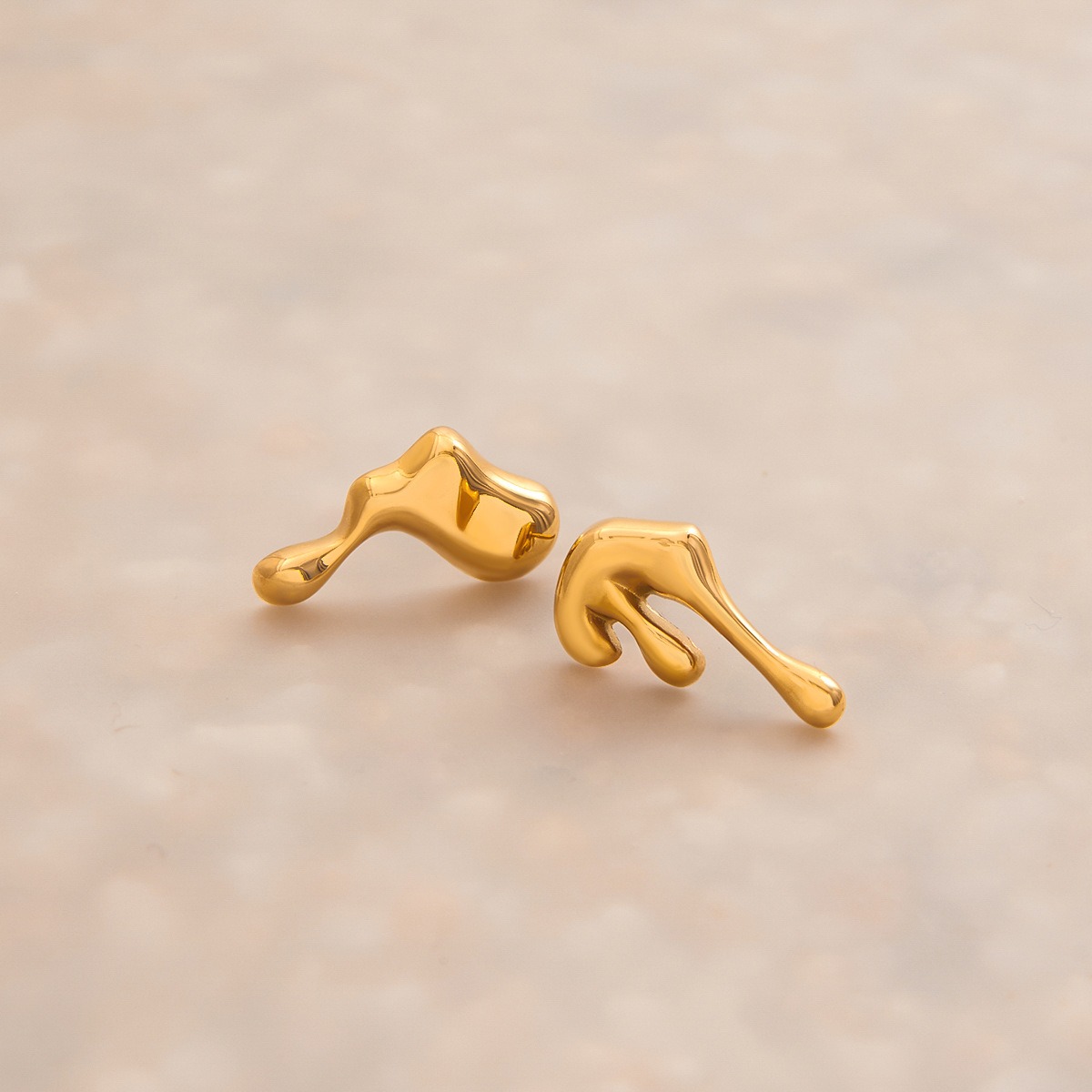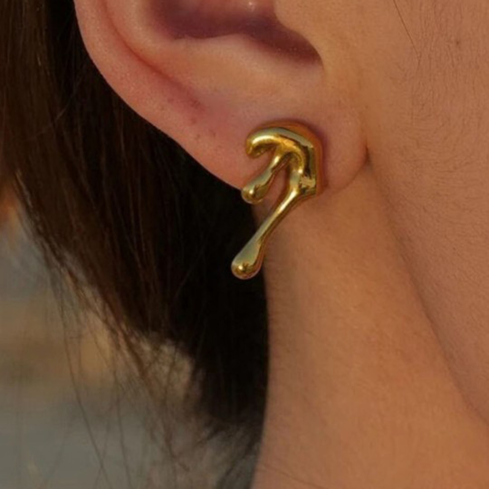 The earrings feature an irregular teardrop design, with the overall lines resembling drops of naturally falling metal, imbued with a sense of fluidity and three-dimensionality, resembling frozen moments of art, creating a visually striking and original look.