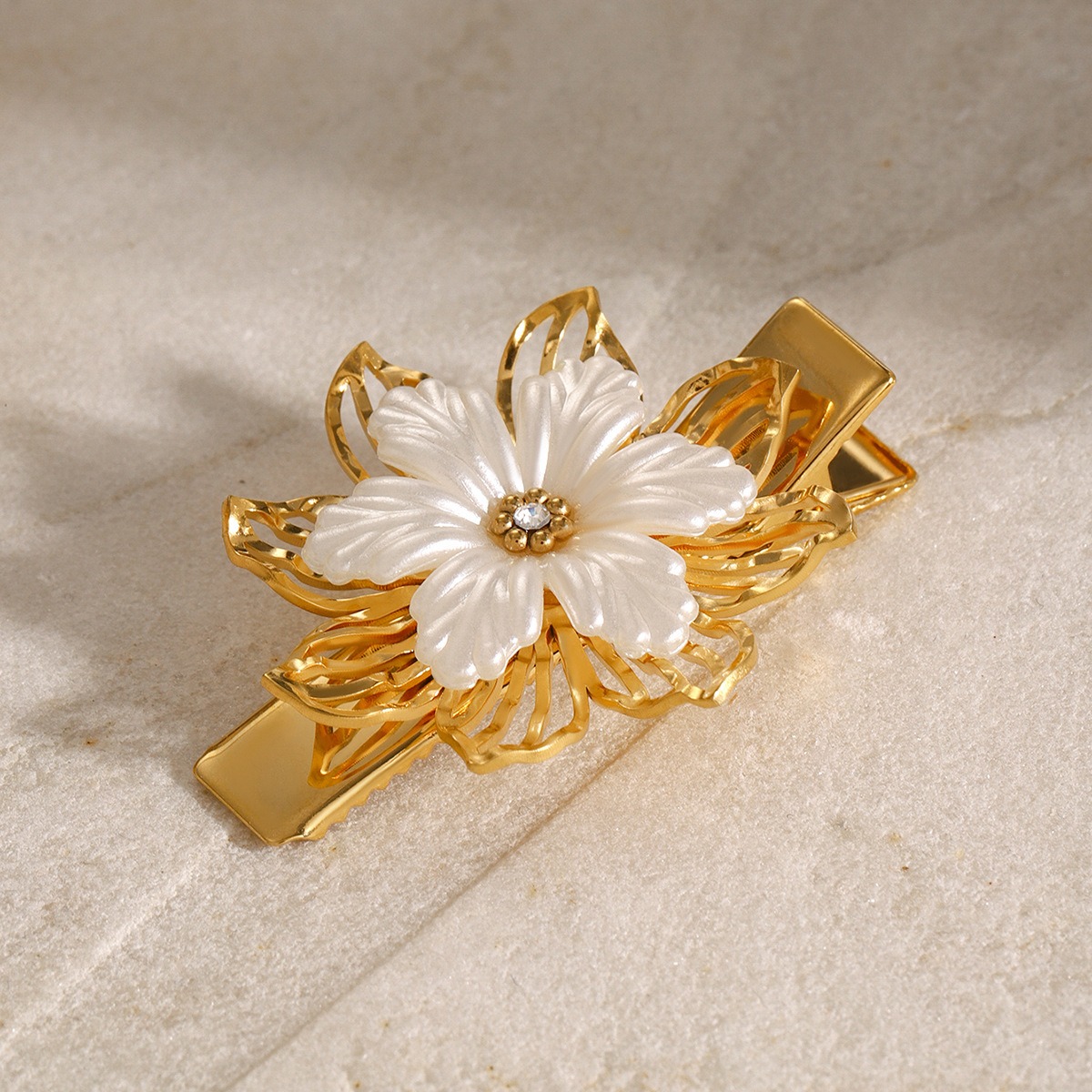 This hair accessory combines exquisite petal texture with hollow design to show the vitality and elegance of flowers. The gemstone inlaid in the center of the flower adds a touch of brilliant light, and the overall design is lifelike. It is both artistic and noble. It is a perfect accessory to show taste and unique charm.