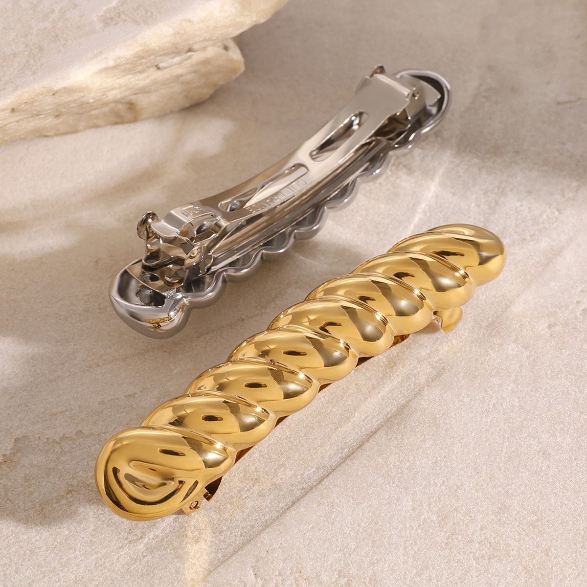 This hair accessory cleverly combines the rope pattern design, showing a unique sense of art and sophistication. Its simple long strip shape is matched with the fine rope pattern, giving people a modern and elegant visual impact, and is a representative of exquisite fashion.