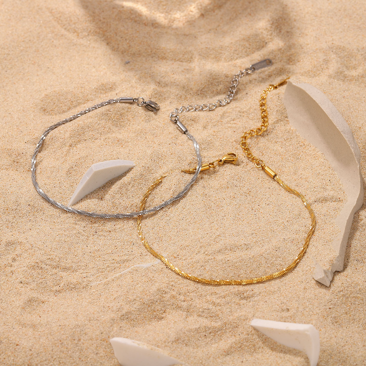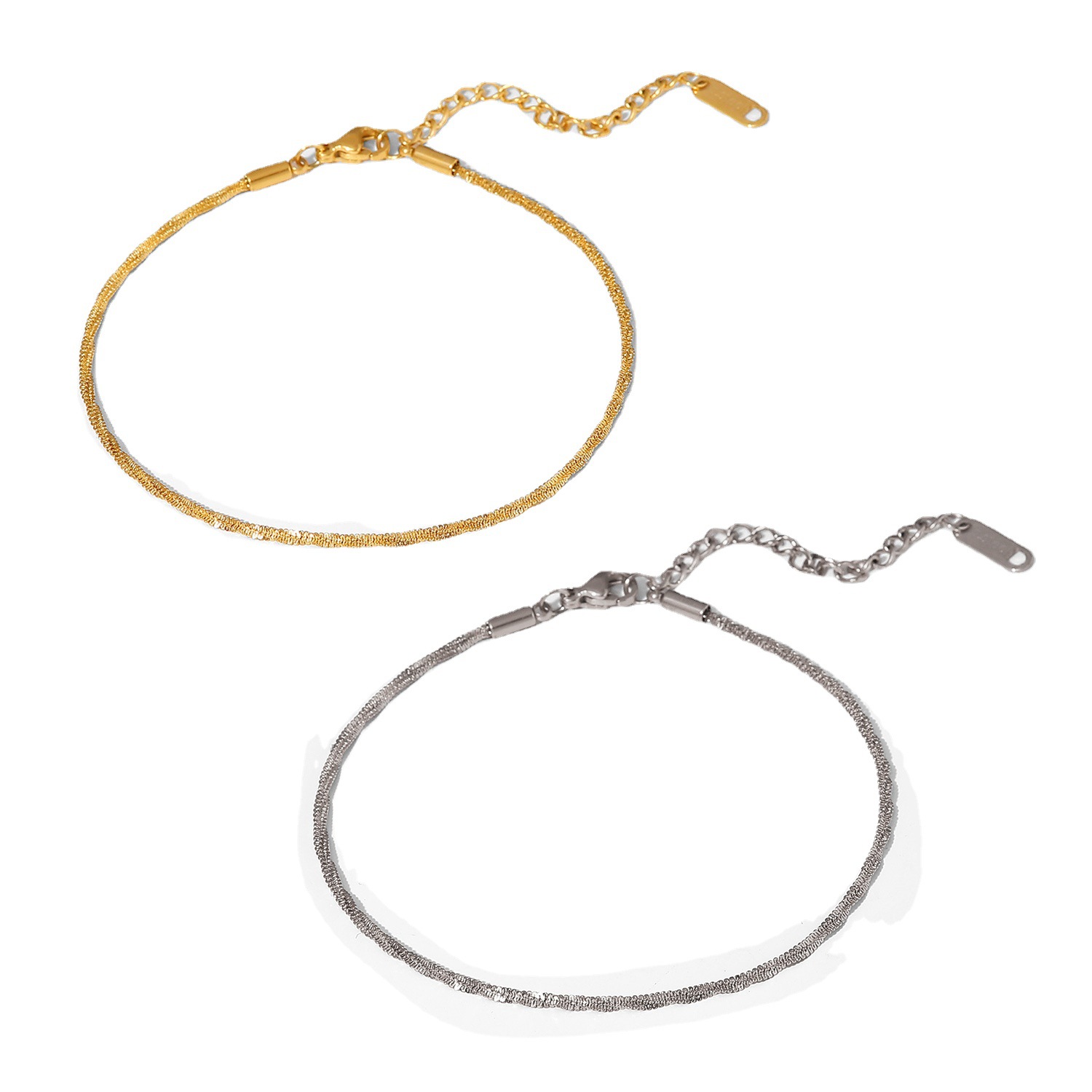 This new titanium steel anklet is fashionable and atmospheric, and the gold/silver sparkling anklet is eye-catching. Crafted from high-quality titanium steel, this anklet is sharp and stylish, which can reflect your own fashion taste. The surface is coated with gold/silver covering, which makes it produce a shining appearance with soft waves, which is resistant to corrosion, wear and aging, and can maintain a clean and bright hazy sparkle for a long time. Matching with your various clothing, it will definitely make you look elegant, and the adjustable length will make your wearing more comfortable and fashionable!